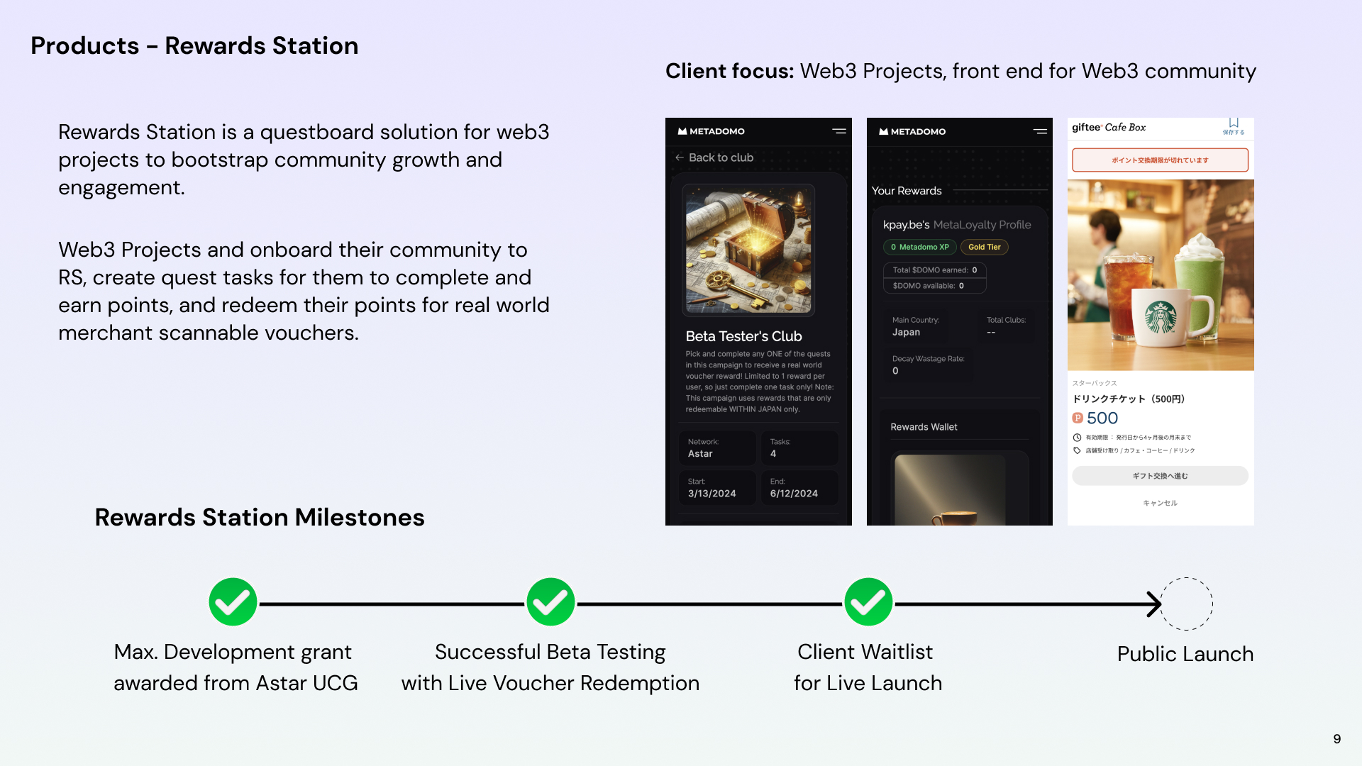 * Rewards Station's backend is connected into [Metadomo Core](https://metadomo.gitbook.io/metadomo-docs/product/metadomo-core), which means user's are building their MetaLoyalty profiles through actions. This MetaLoyalty profile is also connected to other traditional pipelines, such as telco, credit card points, Loyalty points, etc.&#x20;