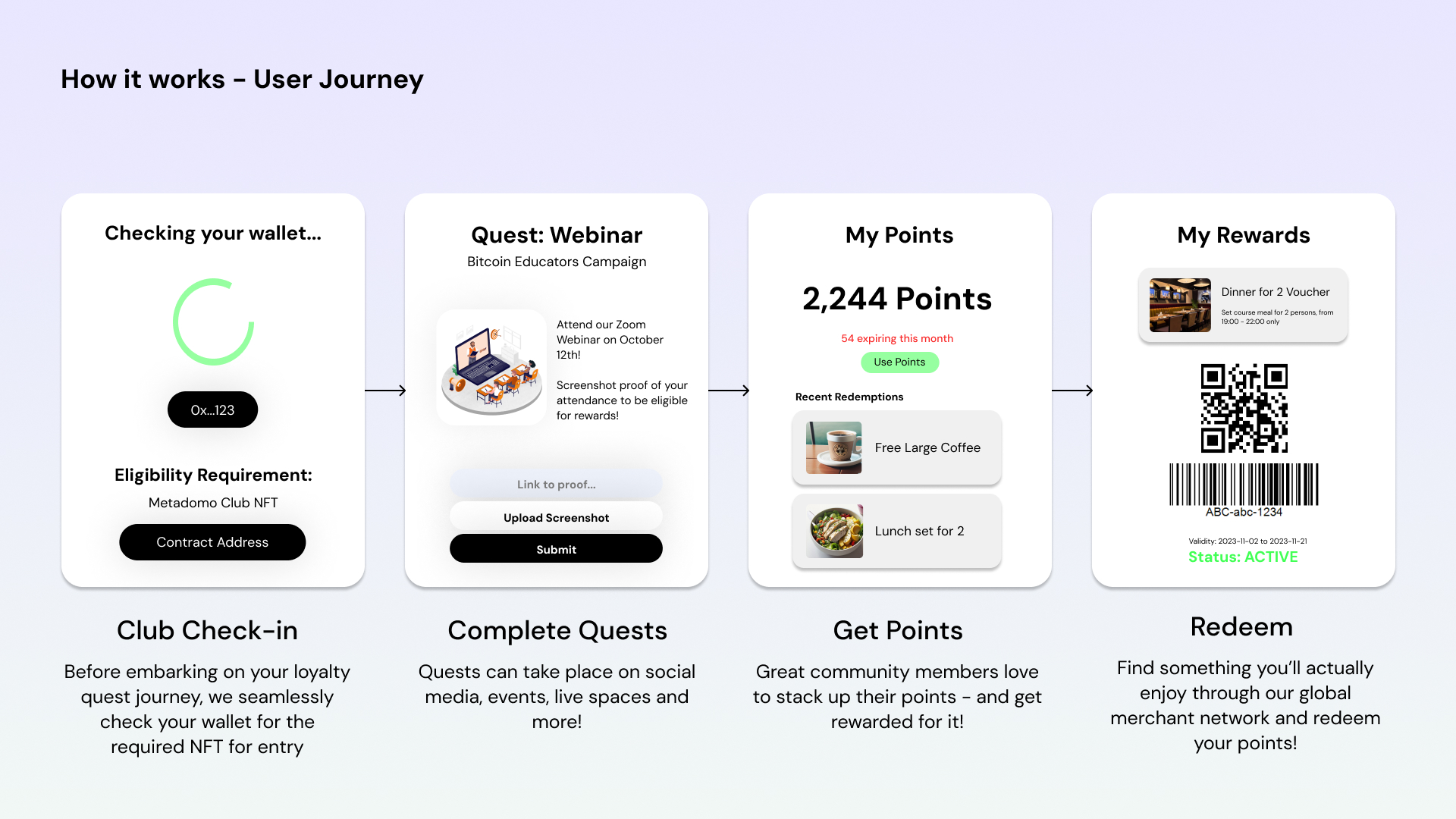 <figure><img src="https://351646694-files.gitbook.io/~/files/v0/b/gitbook-x-prod.appspot.com/o/spaces%2FZf88hp1DibArtkYYeoy6%2Fuploads%2FTIYyIxS0tIKKv7RmIL15%2FMetadomo%20(7).jpg?alt=media&#x26;token=51718e55-3d1c-477f-a5b2-7e6aec6f69b0" alt=""><figcaption><p>User journey</p></figcaption></figure>